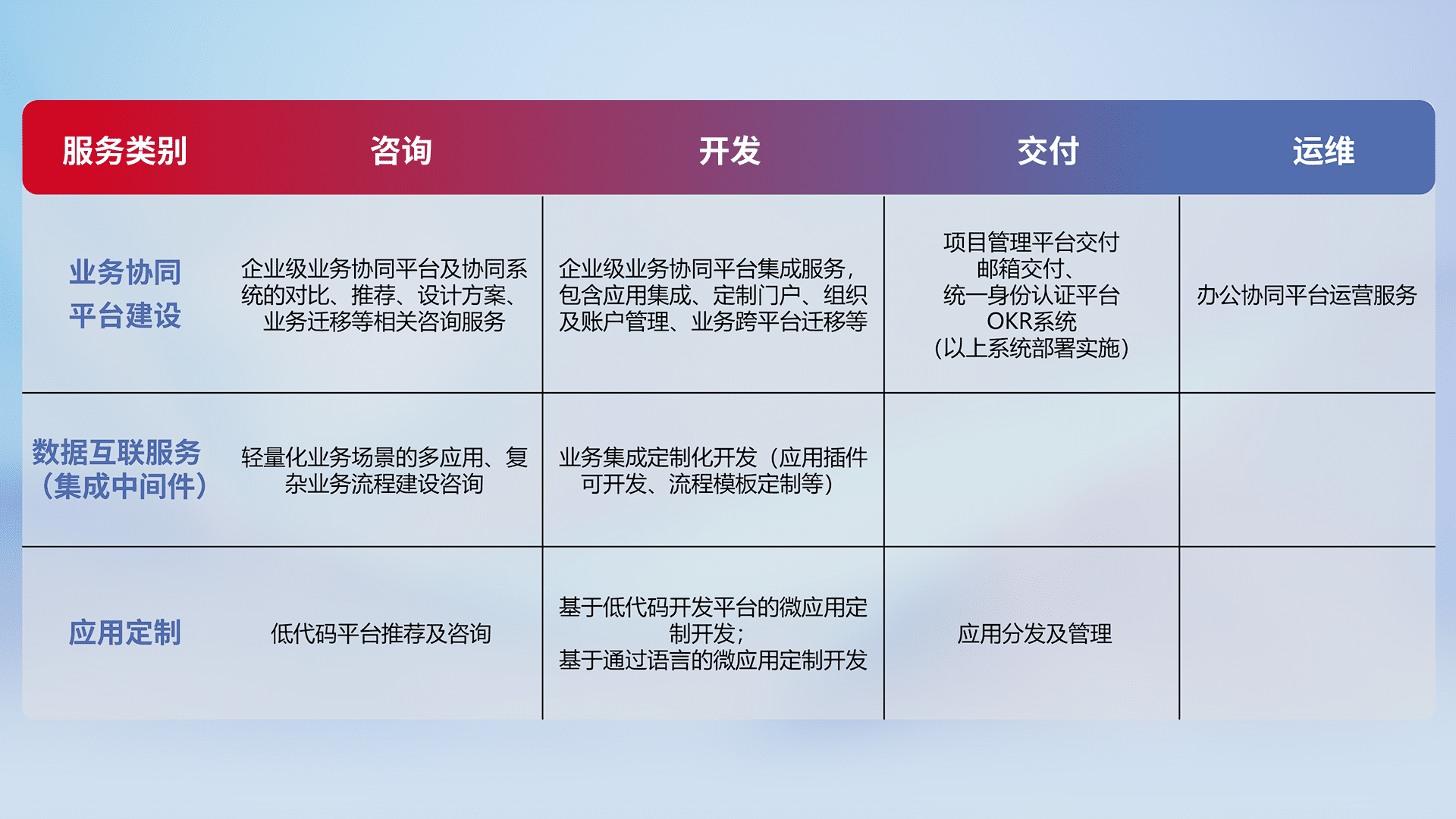 针对钉钉、、企微、、IDaas等平台级产品提供产品的规划、、、、方案、、、、交付、、定制化开发等服务,,实现如统一协同办公、、、智能客户服务、、、混合会议管理、、、智能数据查询、、、、等业务场景,,实现数字化转型。。。